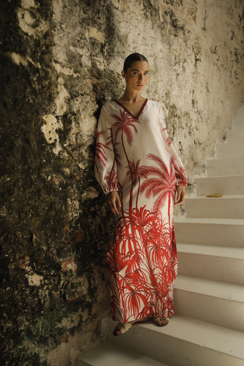 "Palmas" is a lightweight tunic in shades of red, inspired by the calm of the Caribbean and the beauty of its tropical landscapes. A fluid design that conveys freshness and natural elegance, ideal for a free and modern woman.