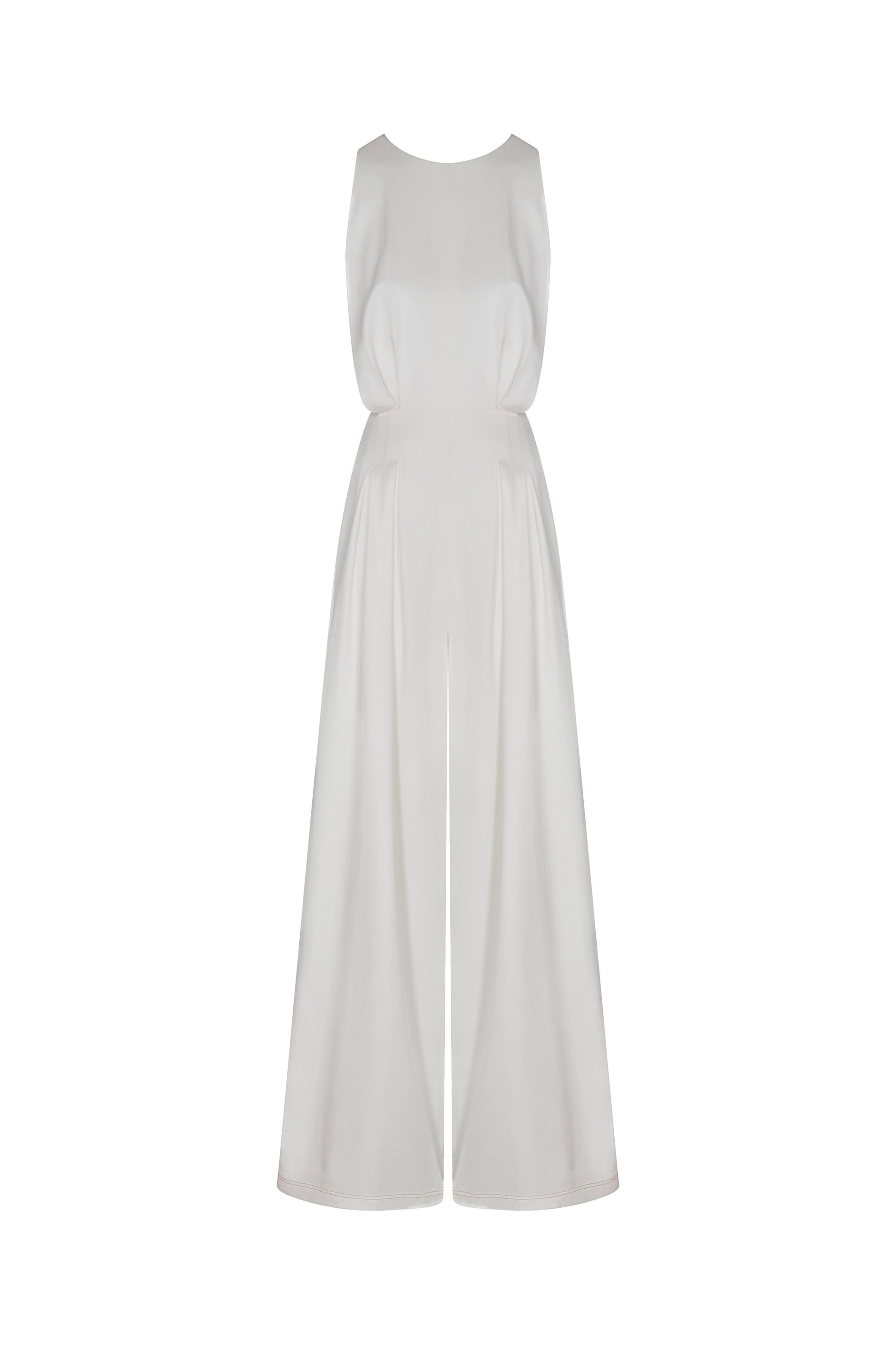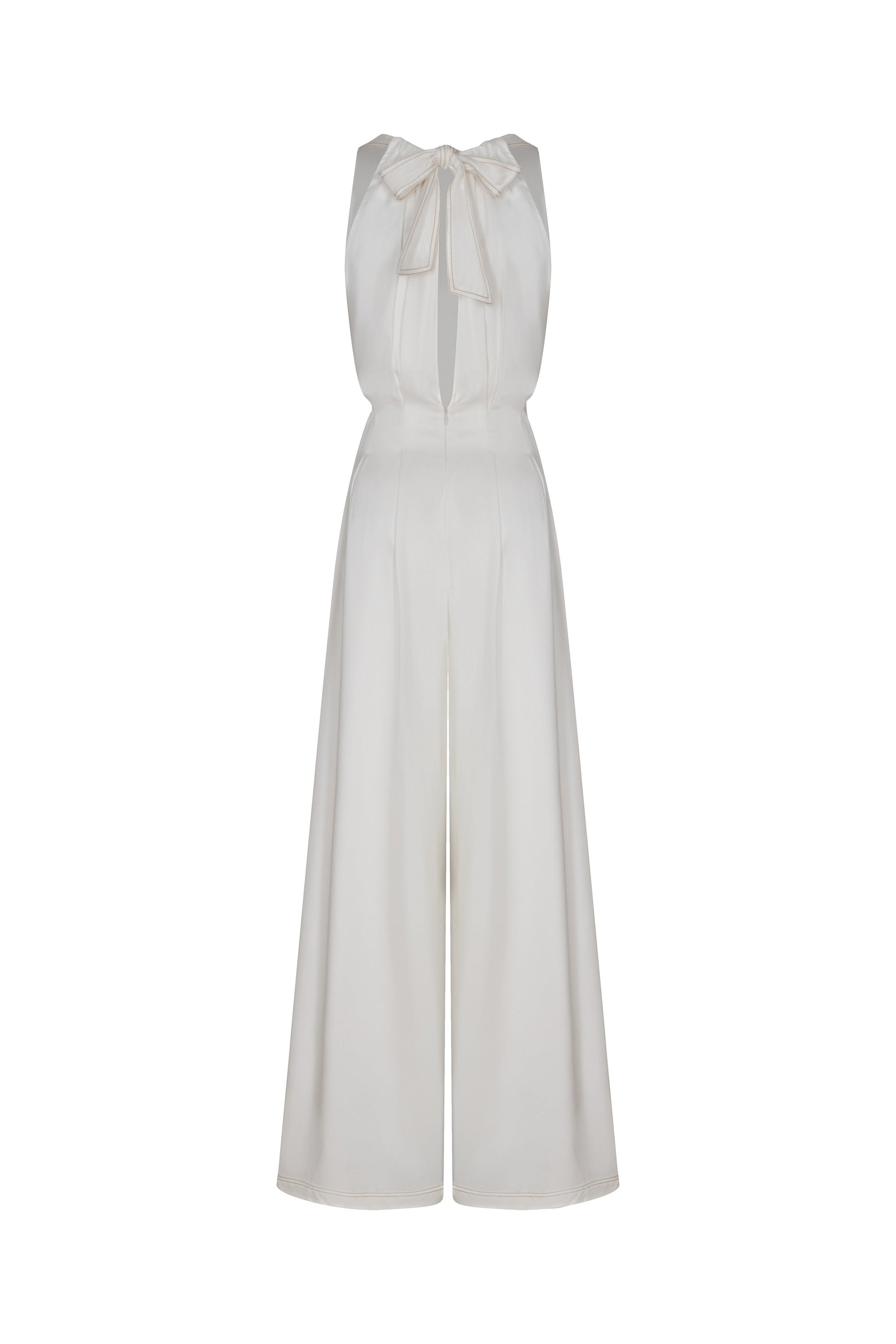 The Bajo Cielo jumpsuit, crafted from 100% rayon, stands out for its off-white tone and flowing silhouette that embodies serene, contemporary elegance.