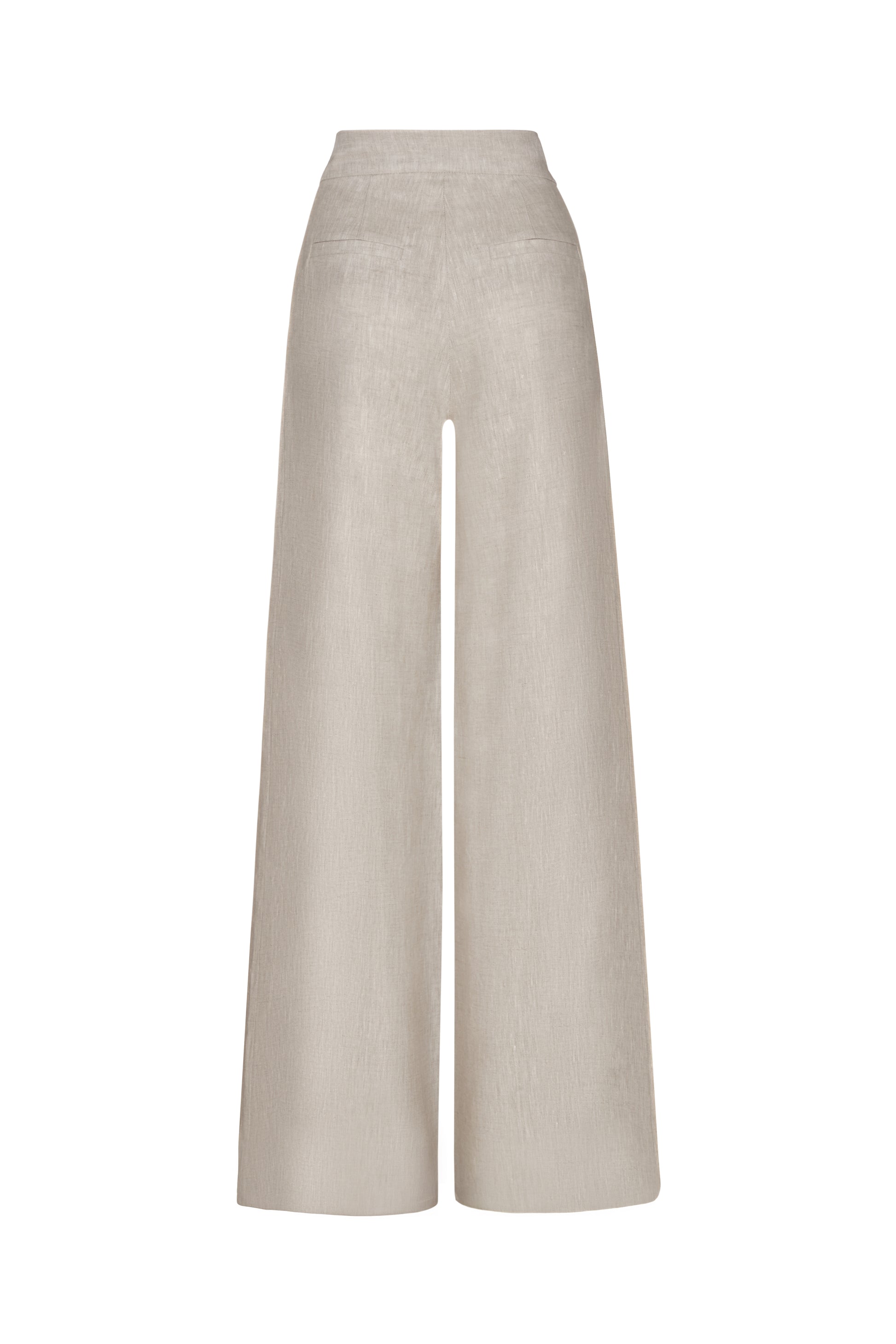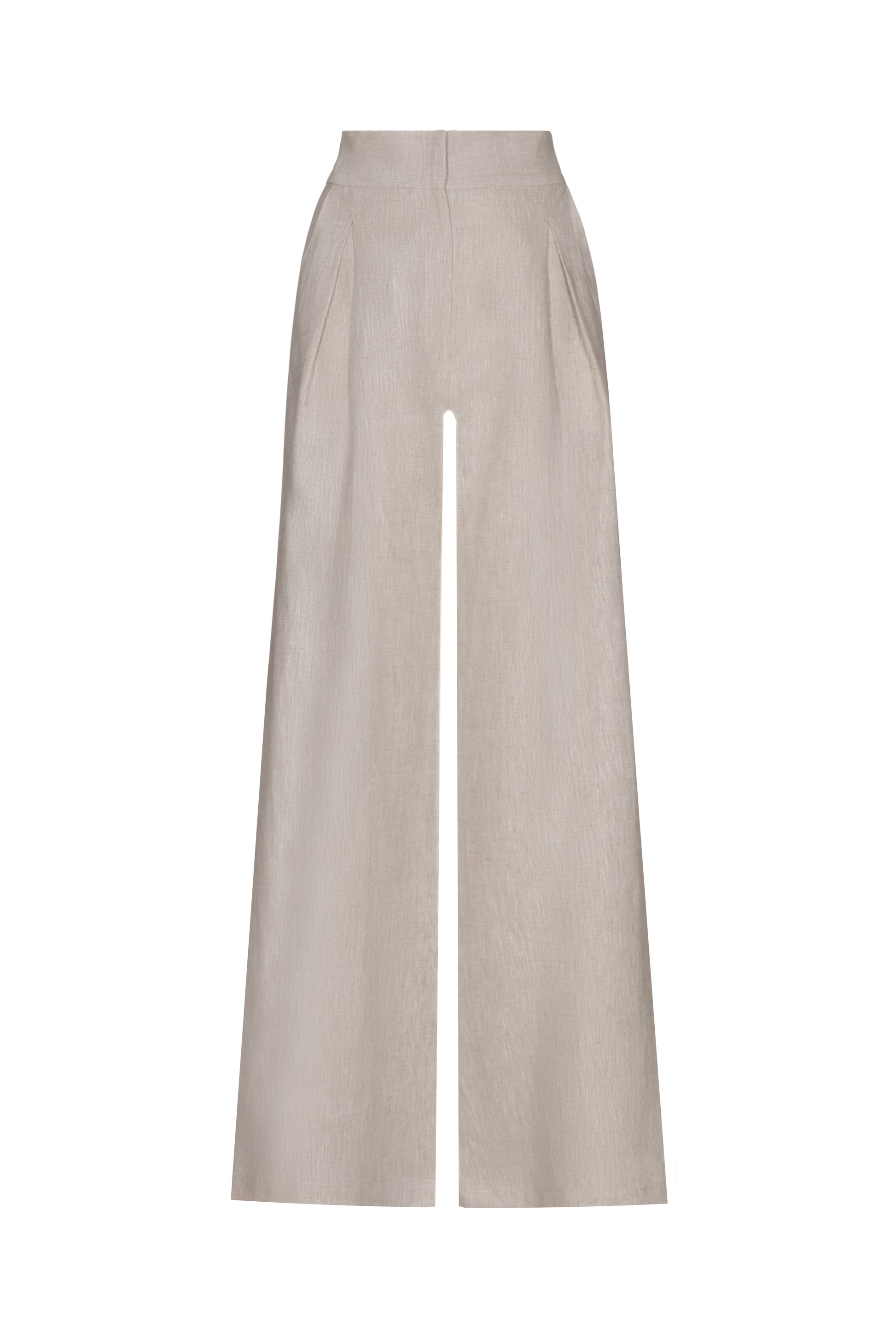 Oatmeal pant with refined front pleats, high waist, and wide-leg cut that elongates the silhouette while offering a versatile, elegant look.