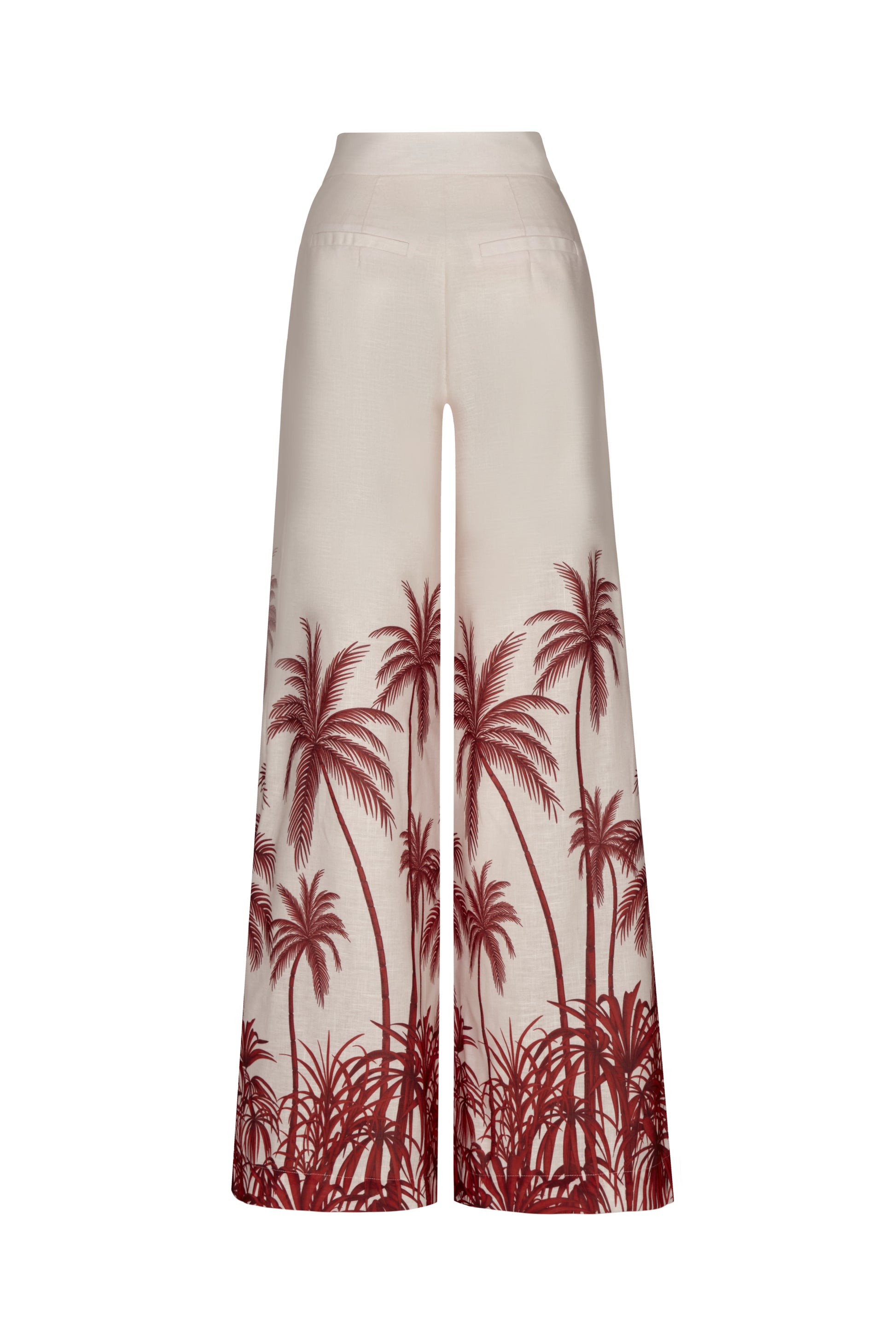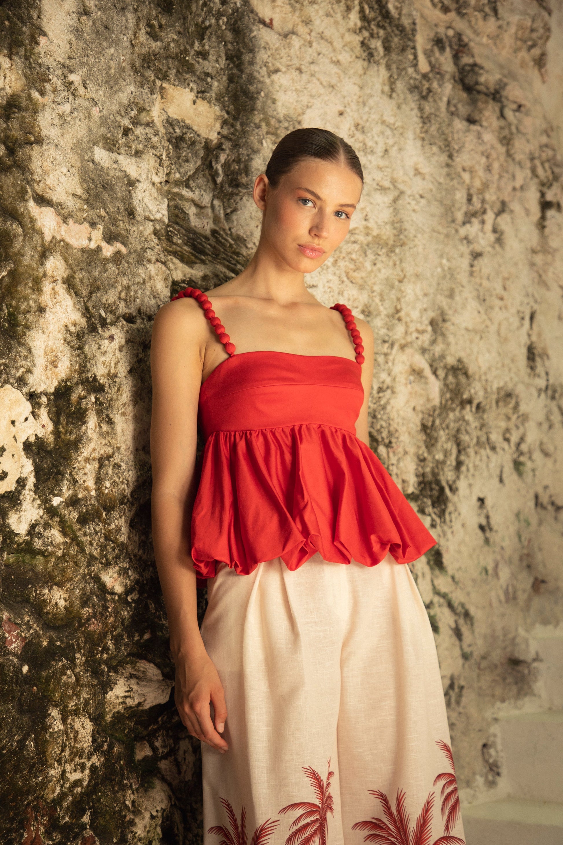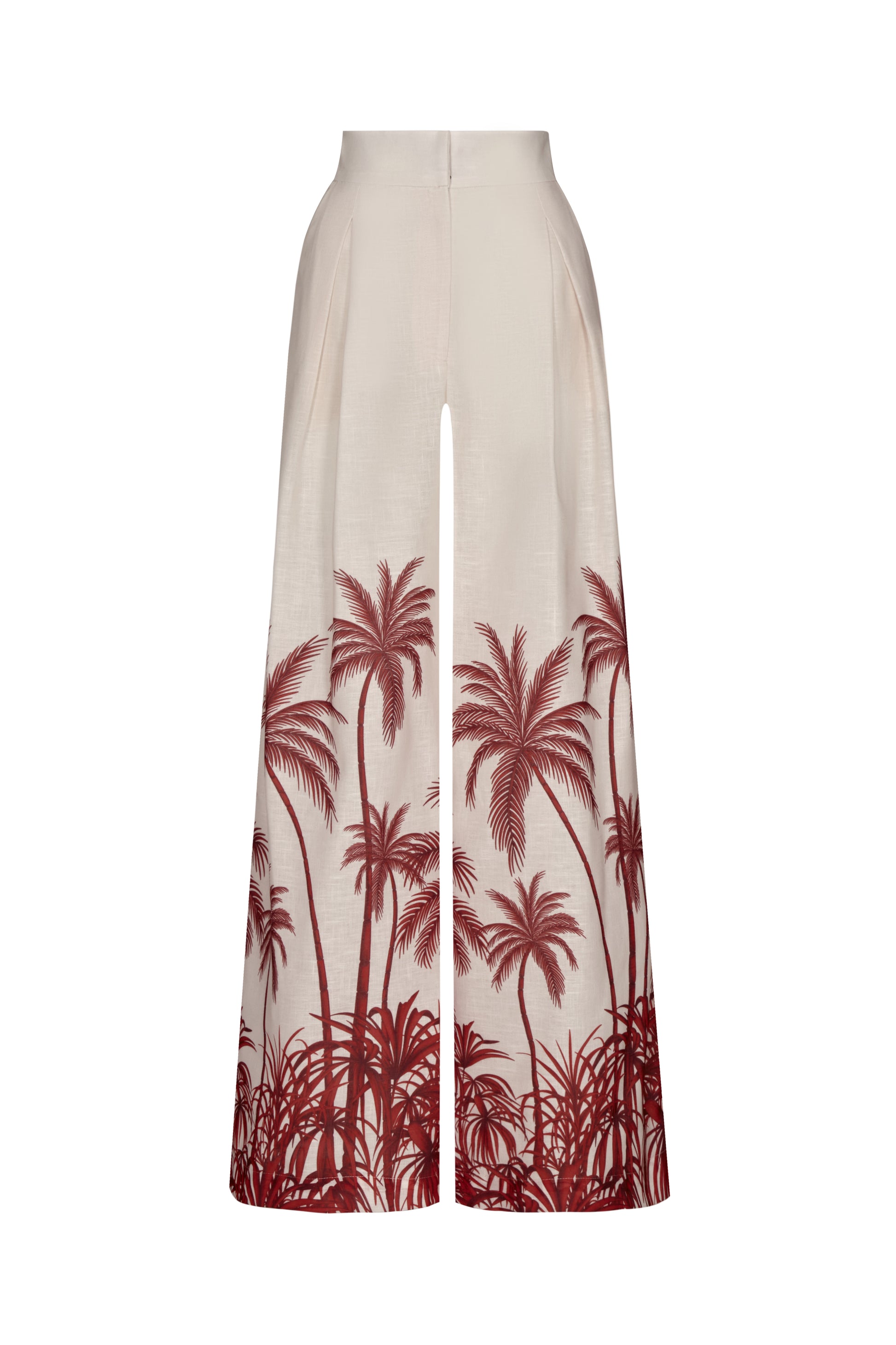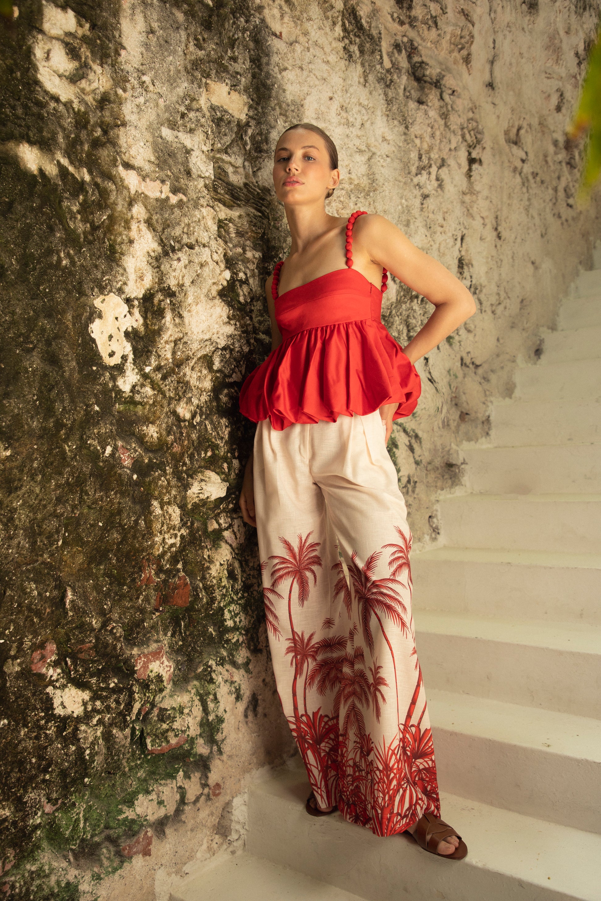 Red linen pants with refined front pleats, high waist, and wide-leg cut that elongates the silhouette while offering a versatile, elegant look.
