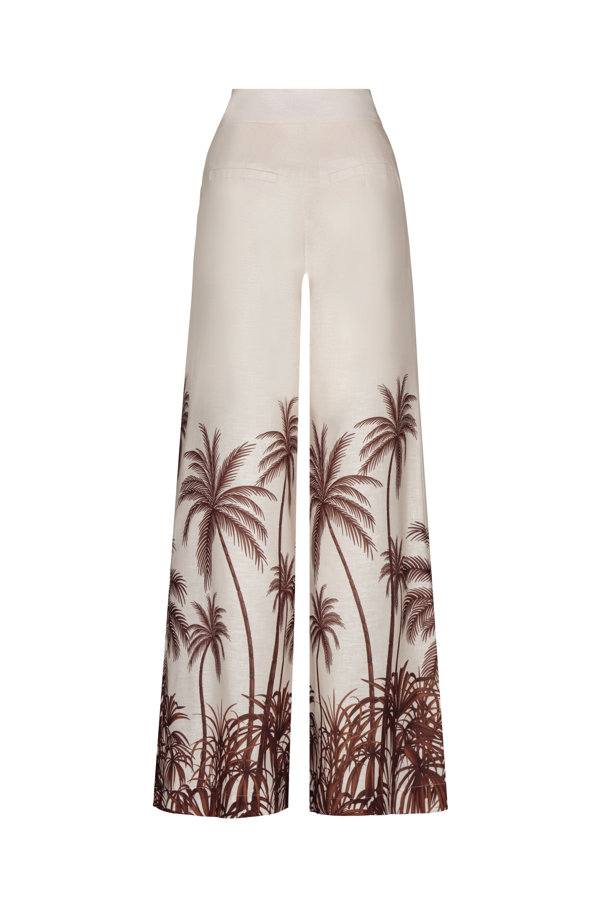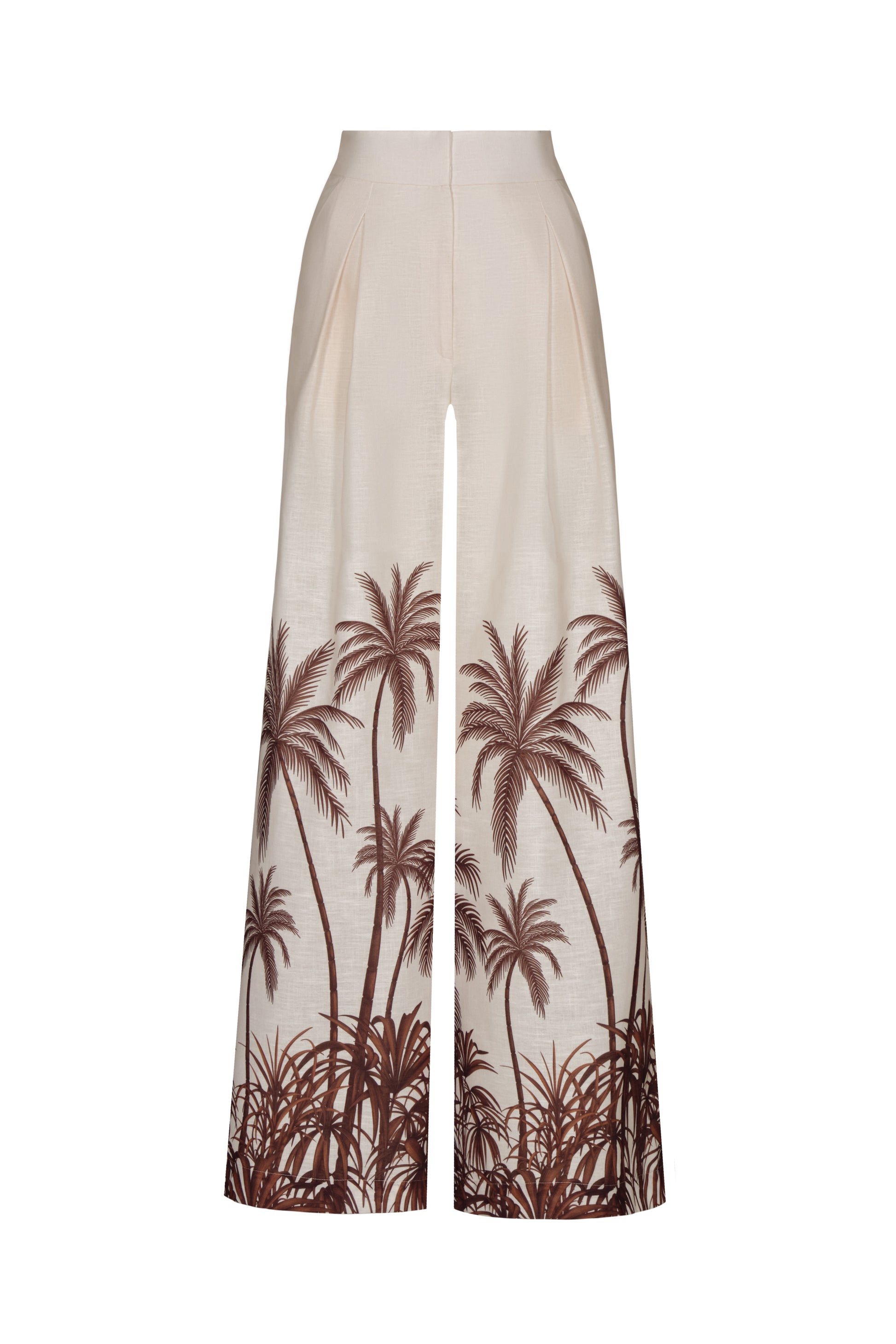 Mocha linen pants with refined front pleats, high waist, and wide-leg cut that elongates the silhouette while offering a versatile, elegant look.