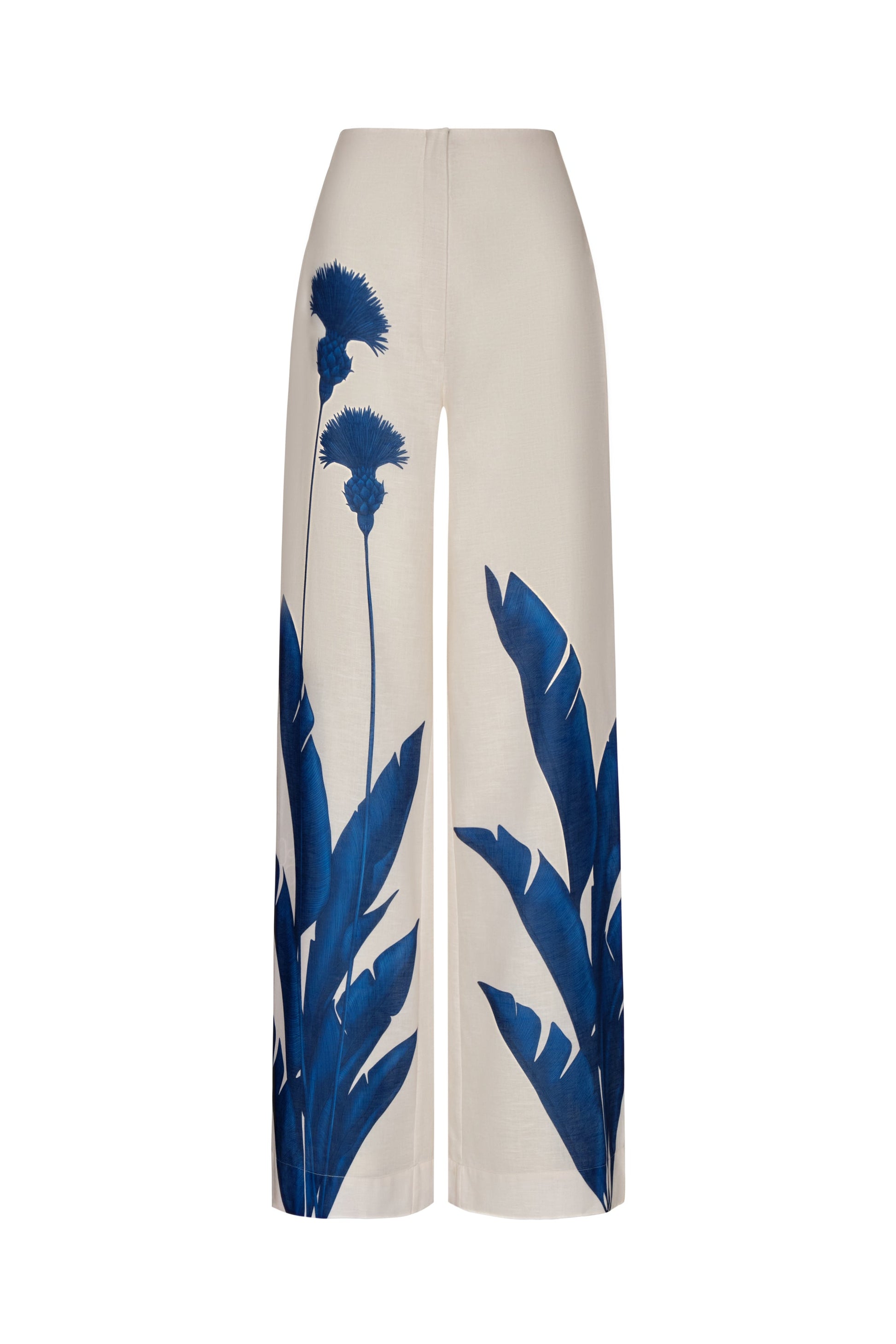 “Ritmica” is a blue pant, featuring a high-rise, straight cut with a wide leg that elongates the figure. Its lime botanical print brings an artistic and sophisticated flair.