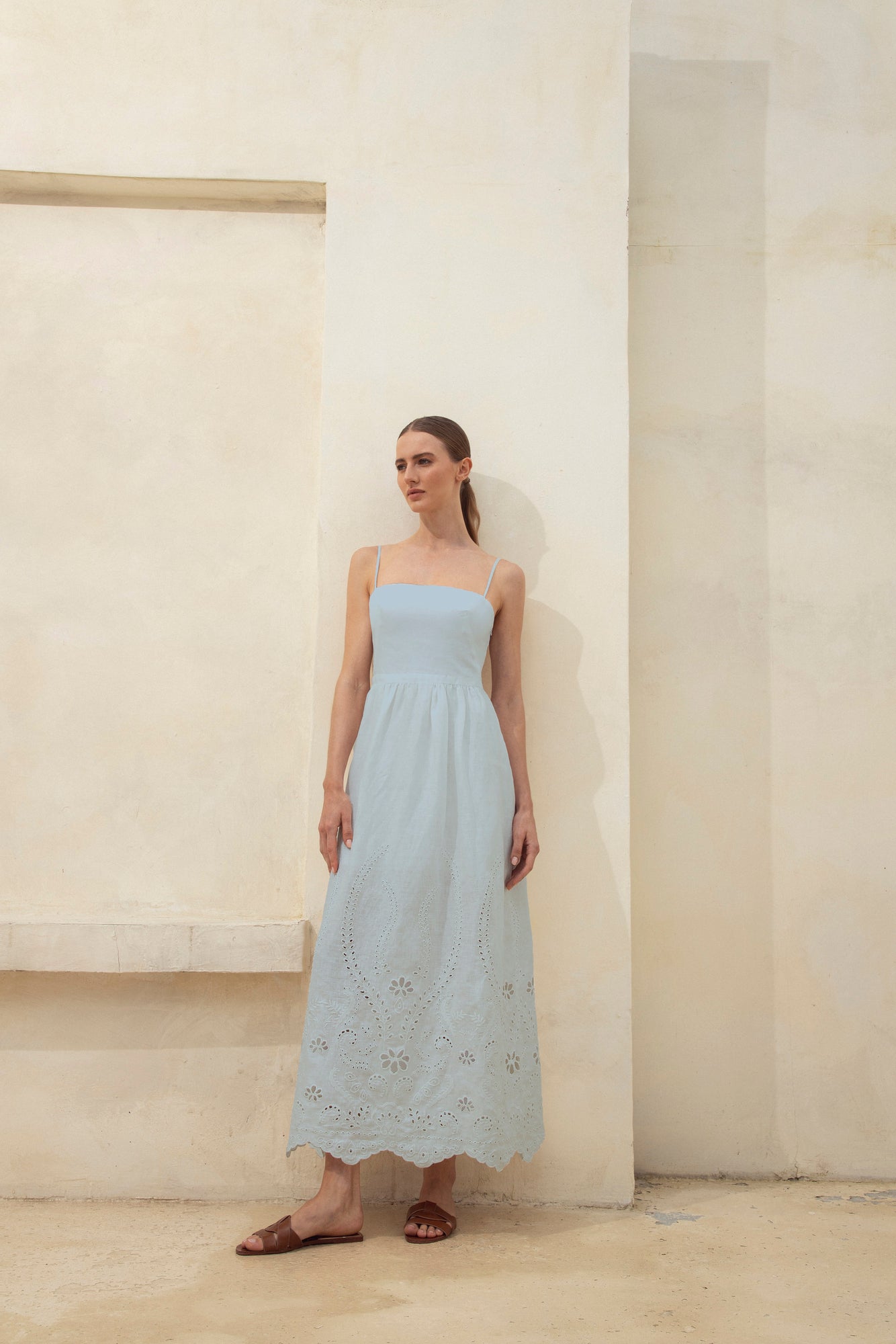 "Y tu Voz" is a maxi dress in light blue linen. It features delicate embroidery that adds a handcrafted touch to its simple and elegant design. A light and elegant piece.
