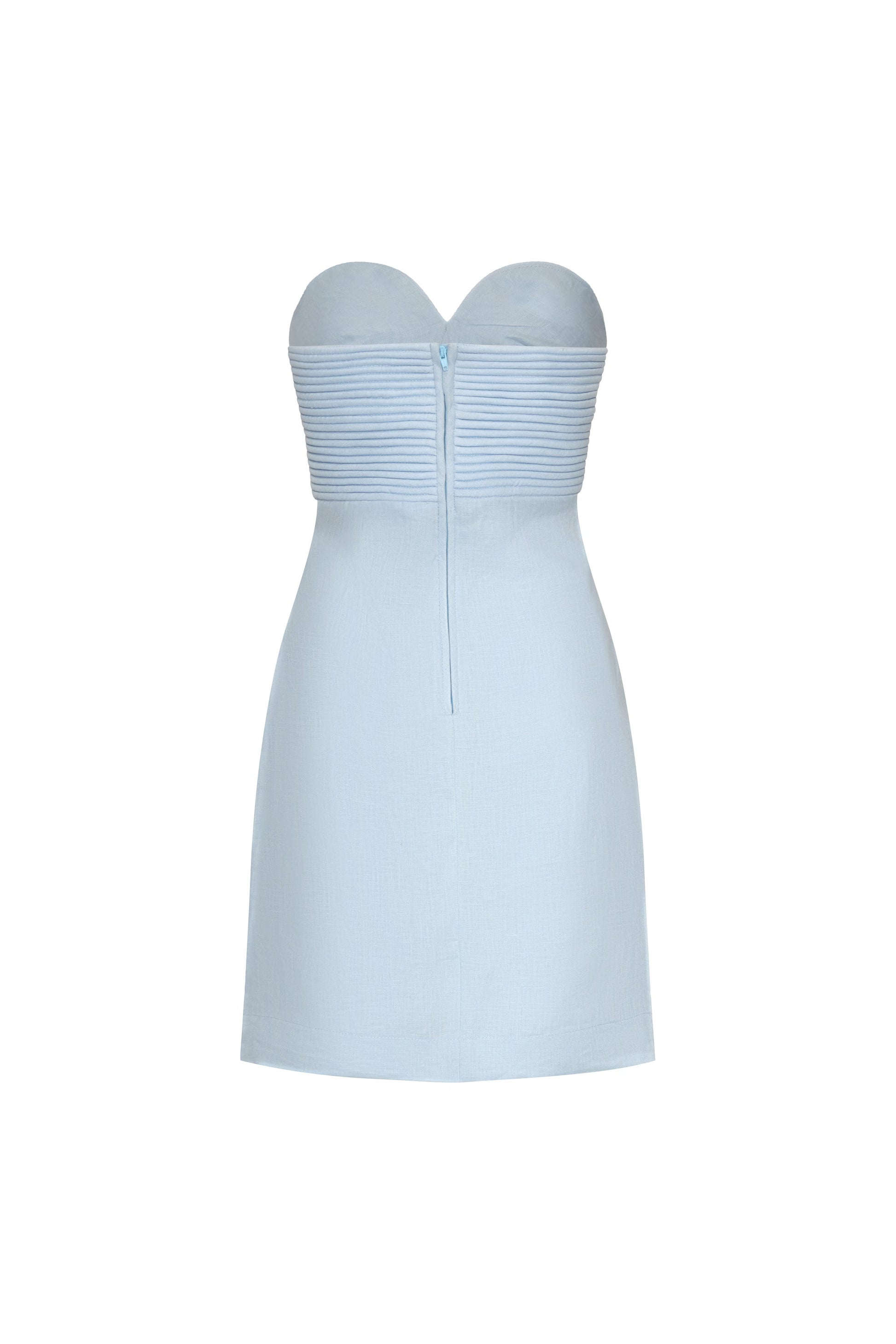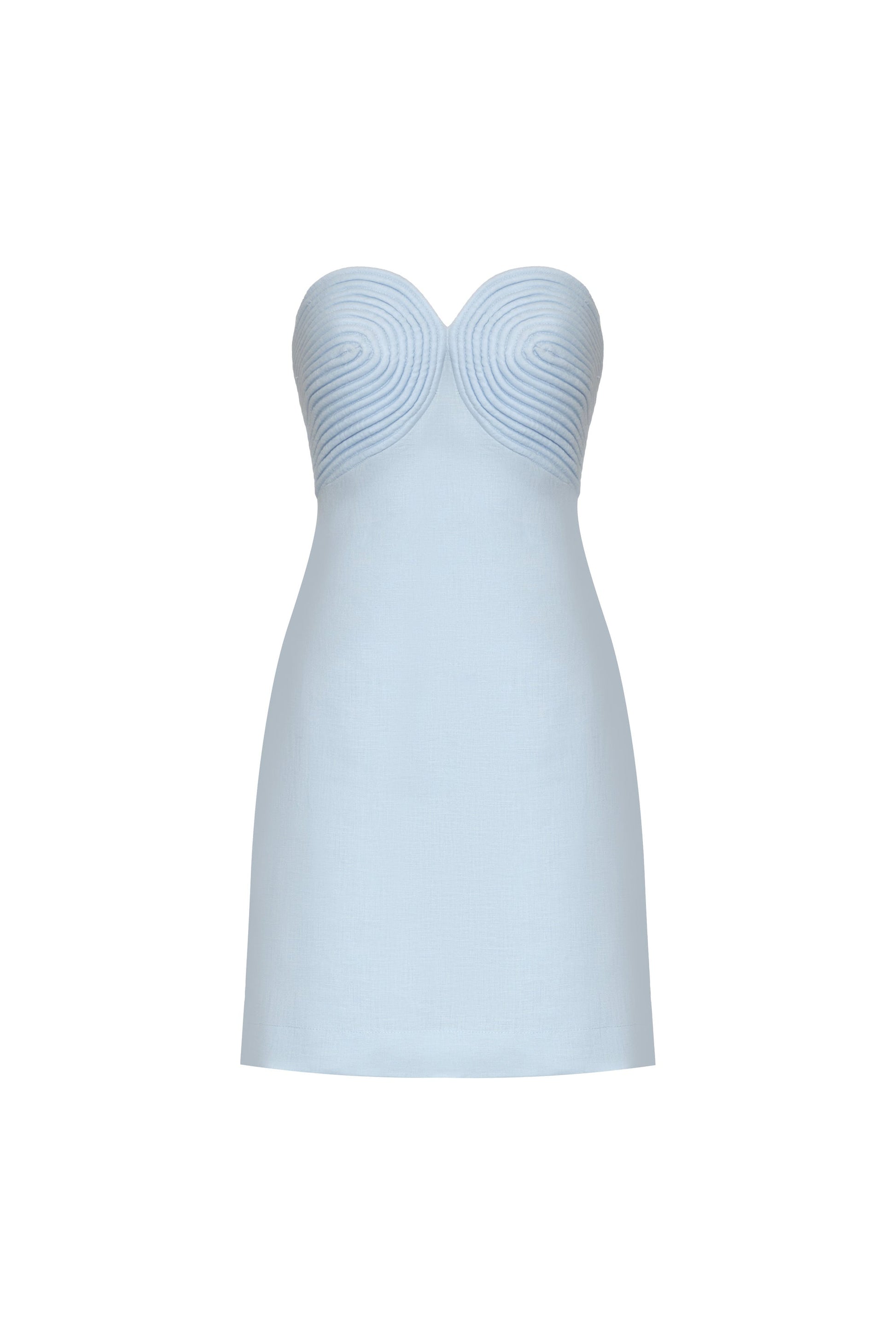 “Amari Ama” is a light blue linen mini dress. Its design features embellished details that add shine and texture while keeping a fresh, feminine silhouette. Perfect for casual occasions with a refined touch.