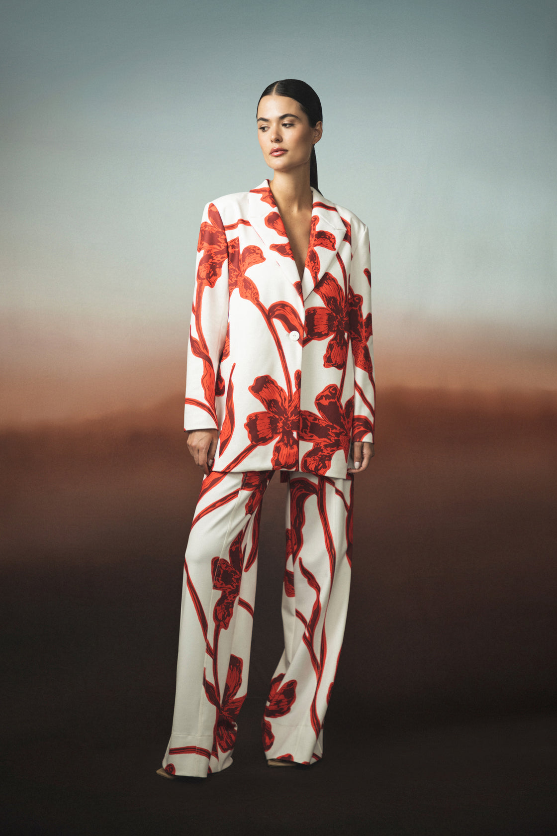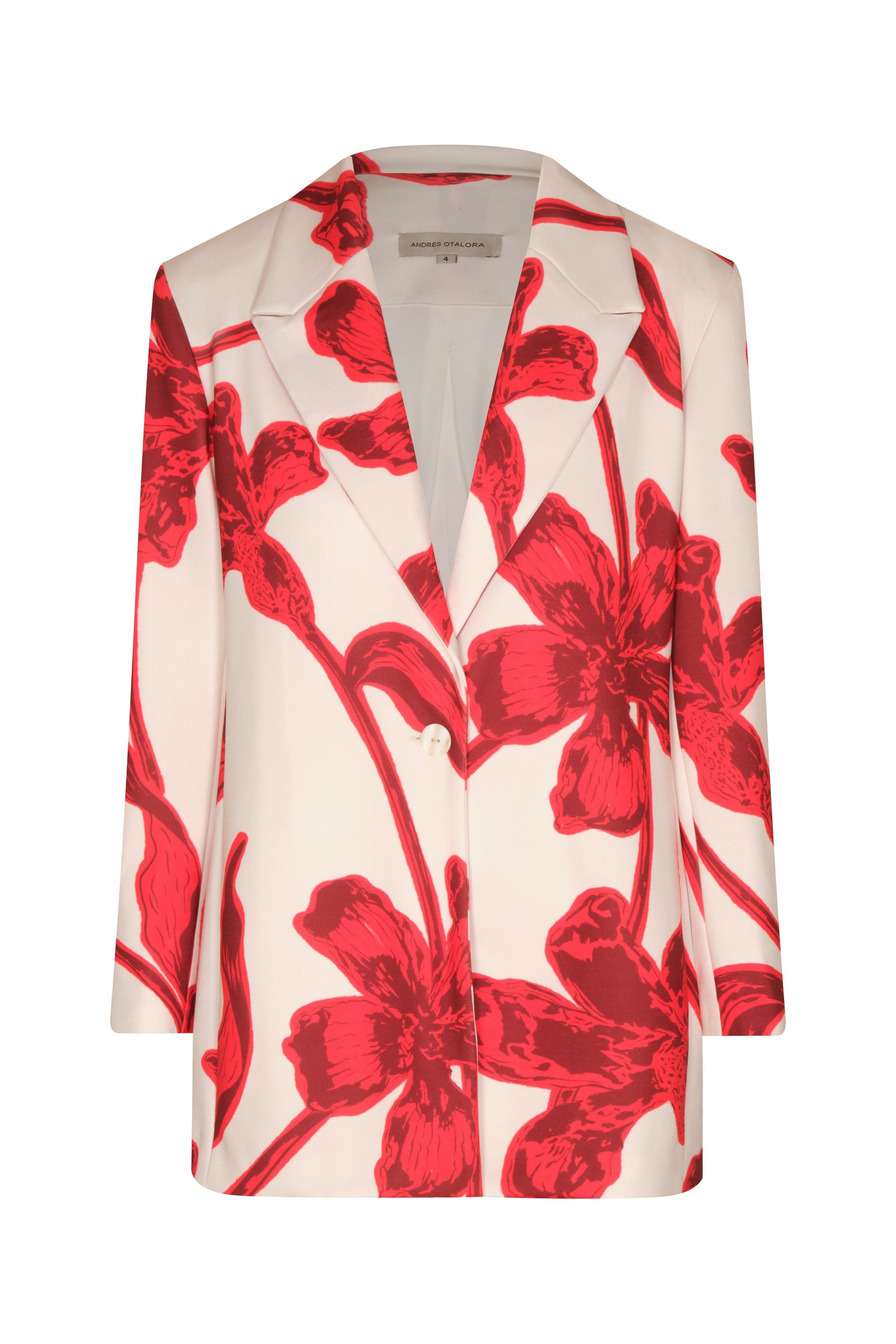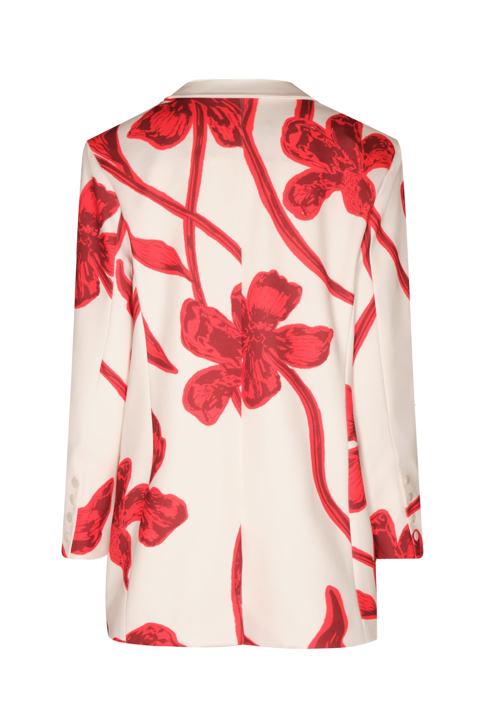 Short blazer in an Ivory - Red Lilies print , crafted from 100% linen. It features a straight cut, classic lapels, and a hip-length silhouette. A lightweight garment with a defined structure.